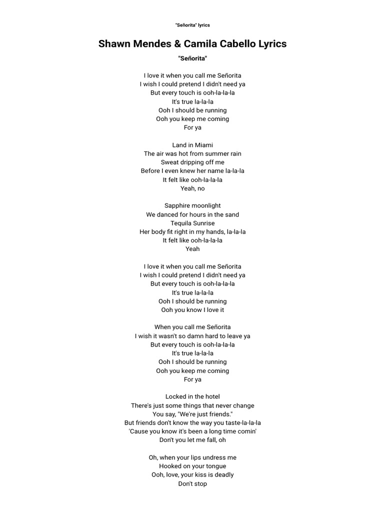 Shawn Mendes Camila Cabello Senorita Lyrics Genius Lyrics I love it when you call me senorita i wish i could pretend i didn't need ya but every touch is ooh la la la it's true la la la ooh i should be running ooh you keep me coming for you.